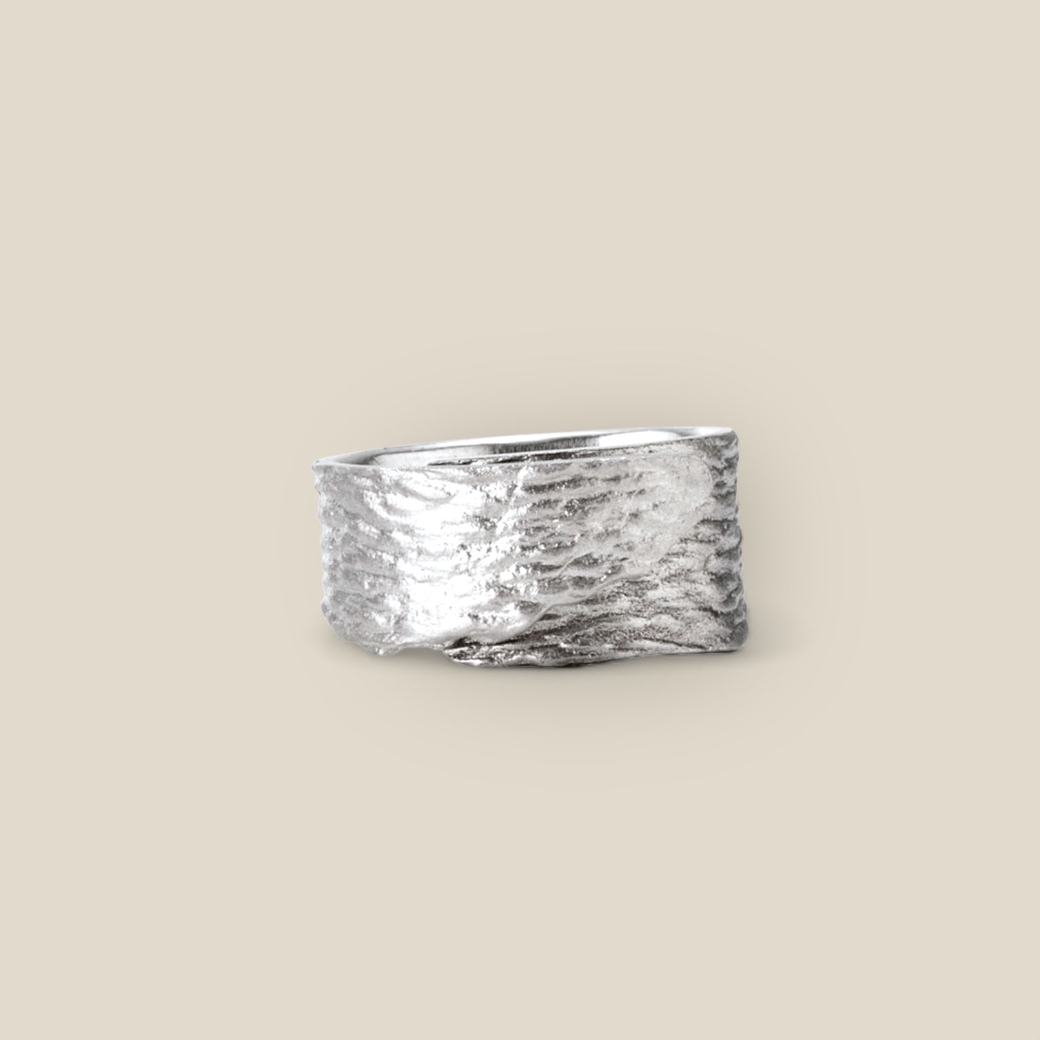 A strip of eucalyptus tree bark curls effortlessly into a contemporary silver ring that's both bold and feminine. A unisex ring that looks great on men and women alike.