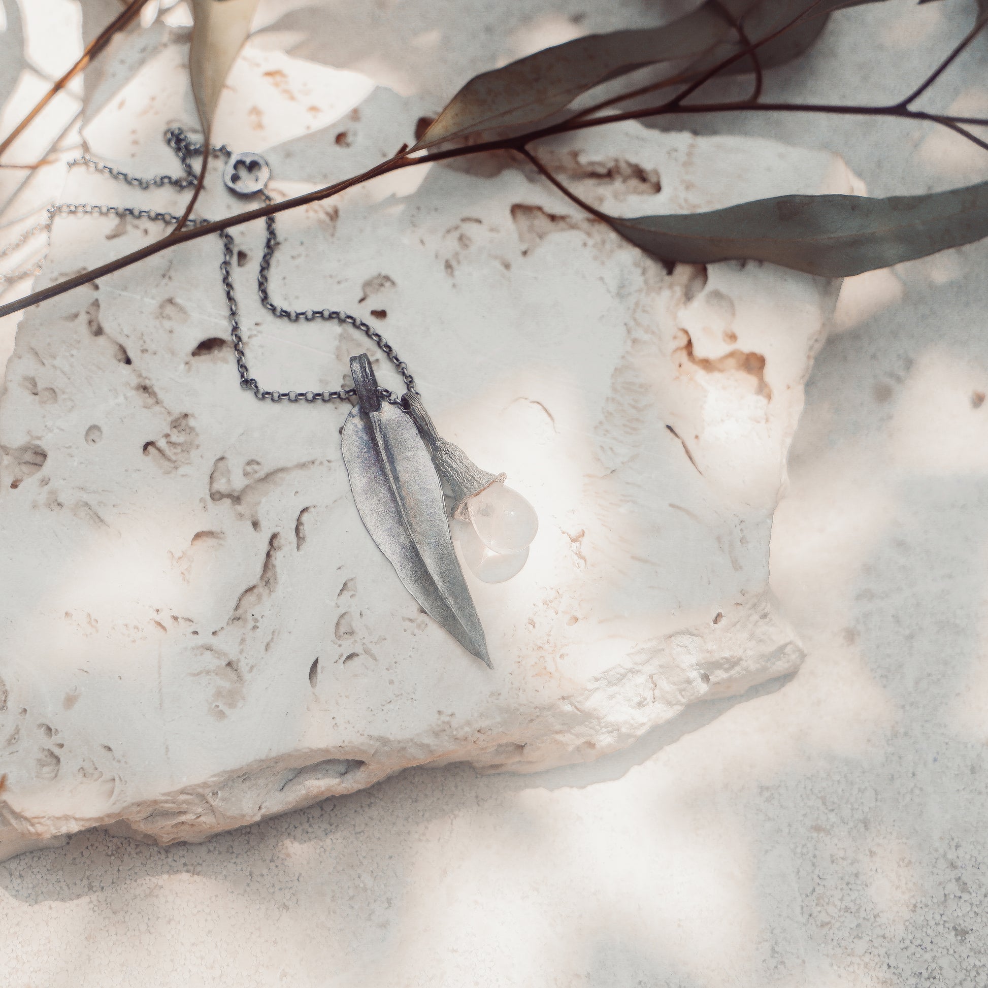 A series of sterling silver charms evoked from Australia's iconic Eucalyptus tree dangle whimsically on a sterling silver chain This earthly necklace combines a gumleaf, a mallee blossom and eucalyptus seed, the mallee blossom finished in your choice of natural coloured gemstones and all charms lightly oxidised to accentuate their natural beauty.
